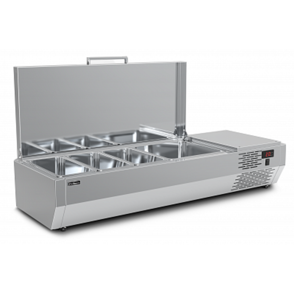 Витрина для ингредиентов Carboma A40 SM 1,2 (3 GN 1/3 + 1 GN 1/2) с крышкой предназначена для охлаждения, кратковременного хранения и демонстрации готовых блюд и ингредиентов, таких как салаты и пицца. Витрина идеально подходит для использования в качестве дополнительного элемента к холодильным столам, столам для пиццы, барным стойкам и прилавкам. Рекомендуется для кафе, баров, ресторанов, магазинов, супермаркетов и других предприятий общественного питания и торговли.