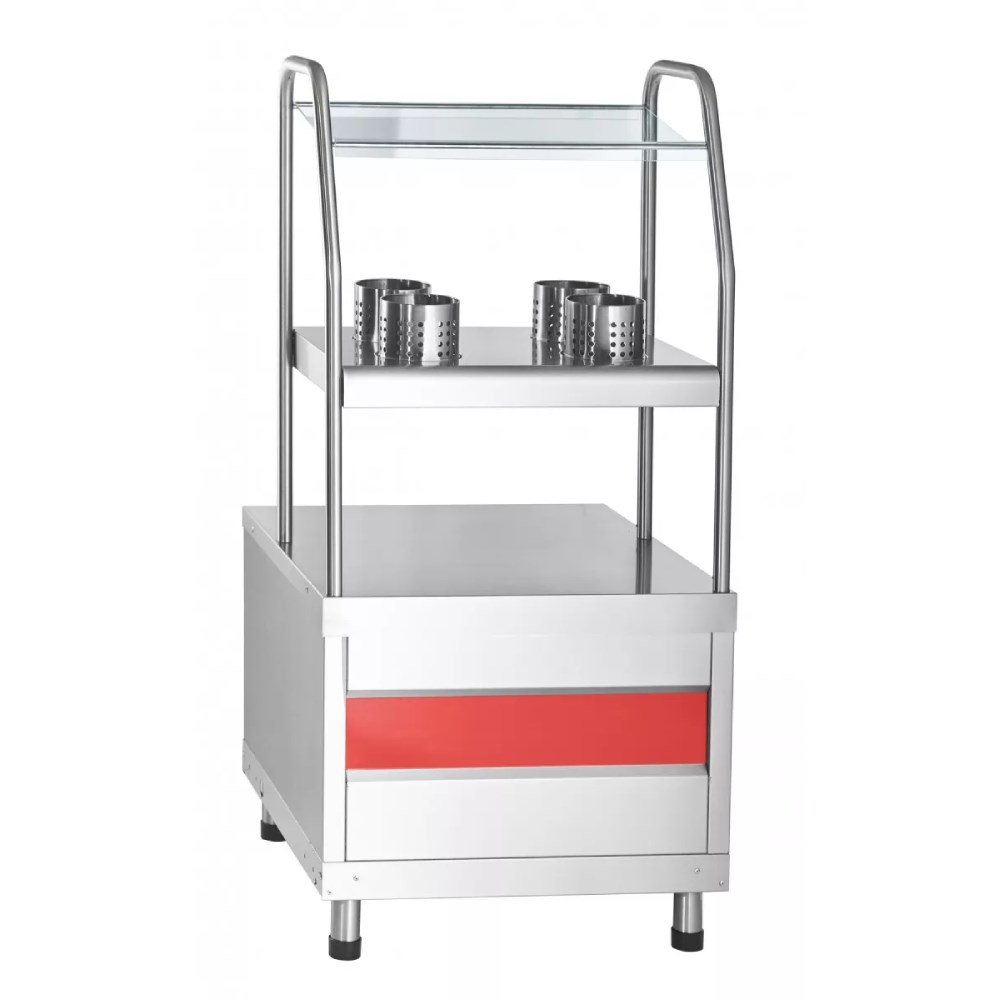 Прилавок для столовых приборов Abat Аста ПСПХ‐70КМ кашир. применяется для оснащения объектов общепита с системой самообслуживания. Он обеспечивает удобную организацию зоны выдачи подносов, стаканов и столовых приборов. Для ложек, вилок и ножей предусмотрена специальная полка с перфорированными контейнерами, которые позволяют упорядоченно размещать посуду. Над рабочей зоной размещена дополнительная полка, предназначенная, в том числе, для выкладки хлебобулочной продукции.