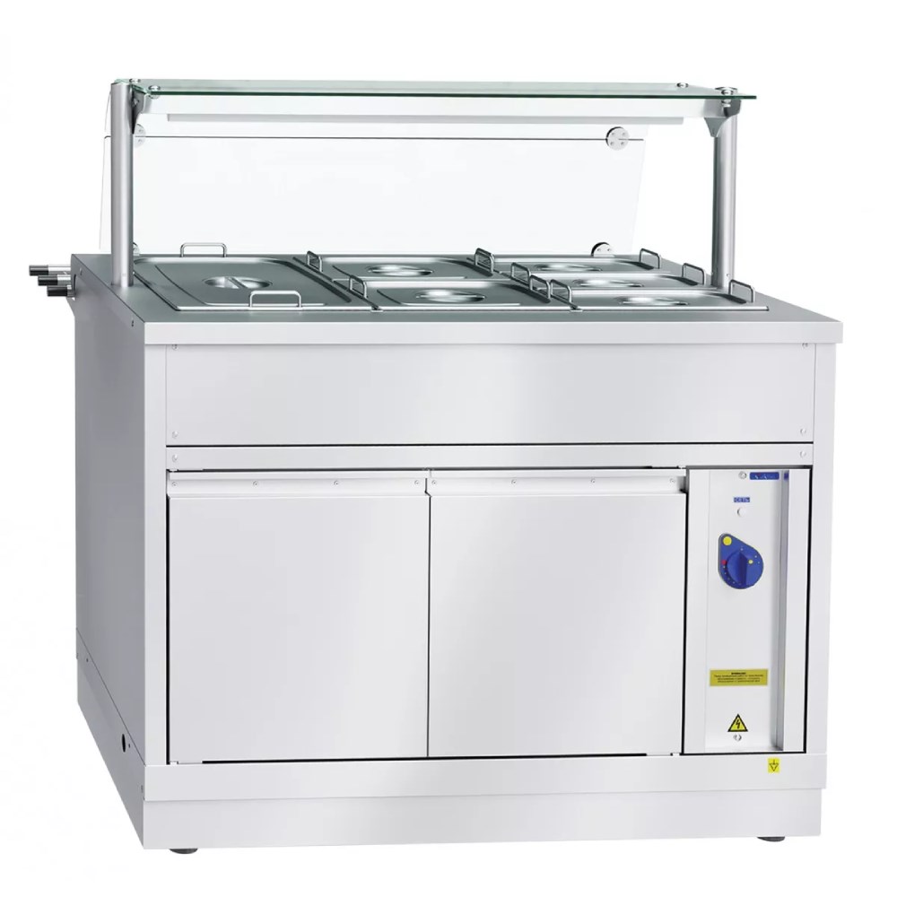 Электрический мармит кухонный 2-х блюд Abat Hot-line ЭМК-70Х применяется для поддержания в подогретом состоянии различных готовых блюд, включая супы и горячие вторые, перед подачей посетителям. Поддержание необходимой температуры осуществляется за счёт паровой ванны, в которую устанавливаются емкости с готовой продукцией. Модель дополнительно оснащена полкой для размещения блюд и встроенным шкафом для расположения кухонного инвентаря. Прилавок можно использовать как в составе линий раздачи, так и в автономном режиме.