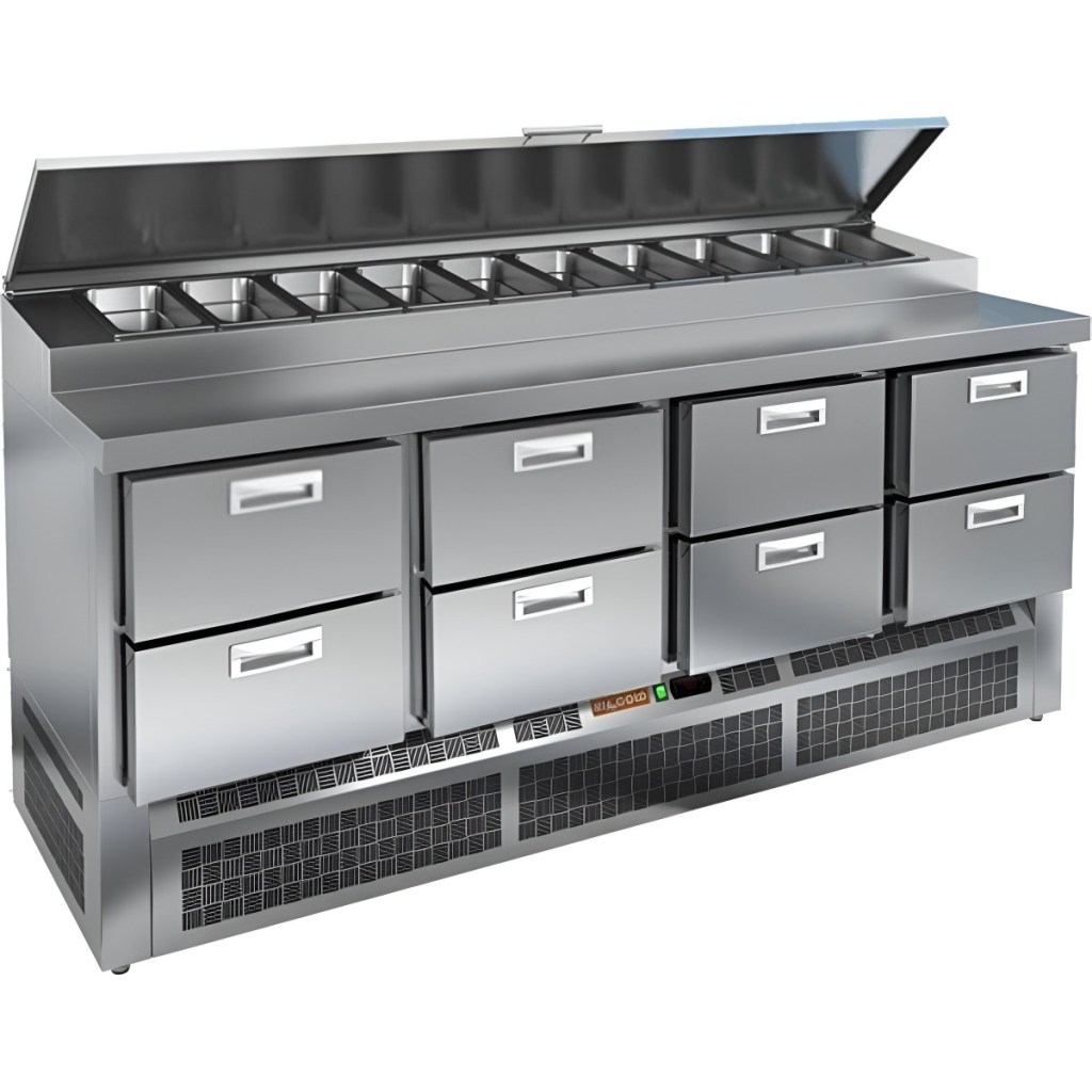HiCold PZE1-2222GN (1/3) с четырьмя выдвижными ящиками — надёжный и функциональный холодильный стол для пиццы и салатов. Продуманная организация хранения и удобство эксплуатации обеспечивают быстрый доступ к ингредиентам и повышают производительность на профессиональной кухне.